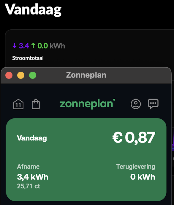 The first picture is from Homey (Sunday, Monday, Tuesday and today) and the second picture is from HomeWizard and Zonneplan (I only have insight into them on Tuesday and today because the Homey Dongle is now also connected).