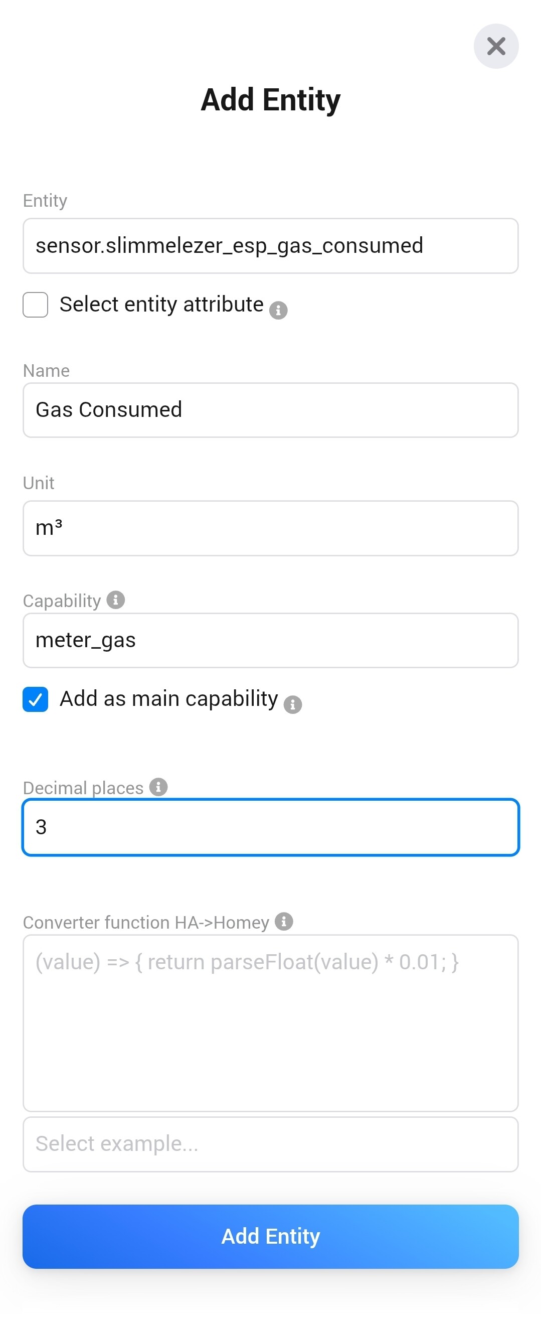 - pick “Add entity”, and in the following screen, select the ESP gas meter entity