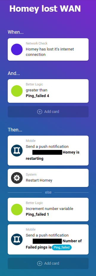 these are screenshots of the previously mentioned flows, that use Network Check, Better Logic (defined variable Ping_failed) and run on Homey v.2.0.5 with power user enabled.