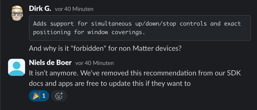 Da ich mich ĂŒber die Info bzgl. der gleichzeitigen Verwendung von windowcoverings_state und windowcoverings_set bei Rollos und Jalousien gewundert habe, was bislang ja fast mit der Todesstrafe geahndet wurde (Irony off), hatte ich auf Slack (Link) nachgefragt, warum das bei Matter GerĂ€ten erlaubt, bei allen anderen aber âverbotenâ sei. Daraufhin habe ich folgende Info erhalten: