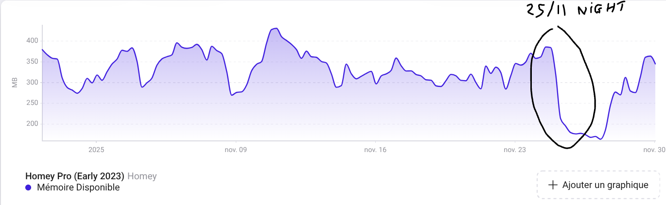 Hello, the available RAM on my Homey Pro was stable (around 300 MB free). Starting the night of November 25th, it dropped drastically.