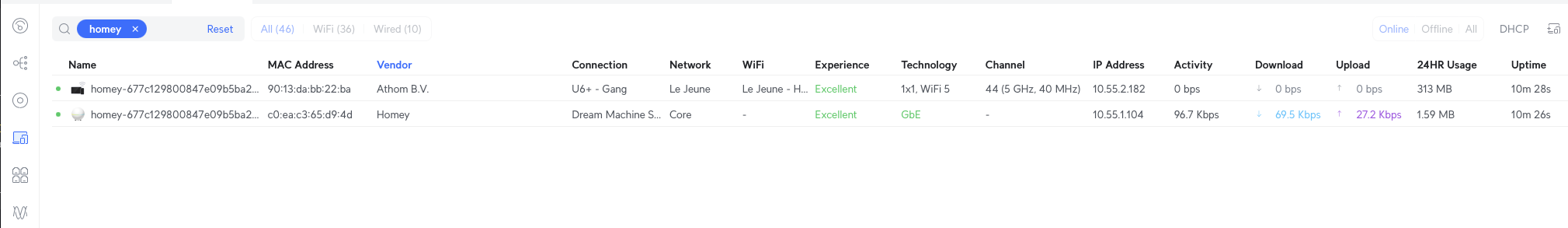 null, all Ethernet-related fields arenull. - Homey only reports being connected via Wi-Fi (