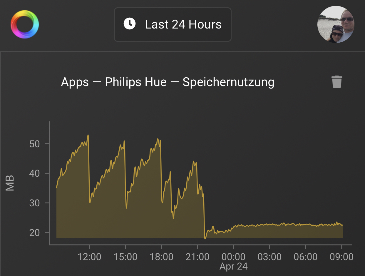 Der Speicherverlauf ist aber nach 12 h immer noch sehr niedrig, über alle Apps hinweg! Auch der der Hue App