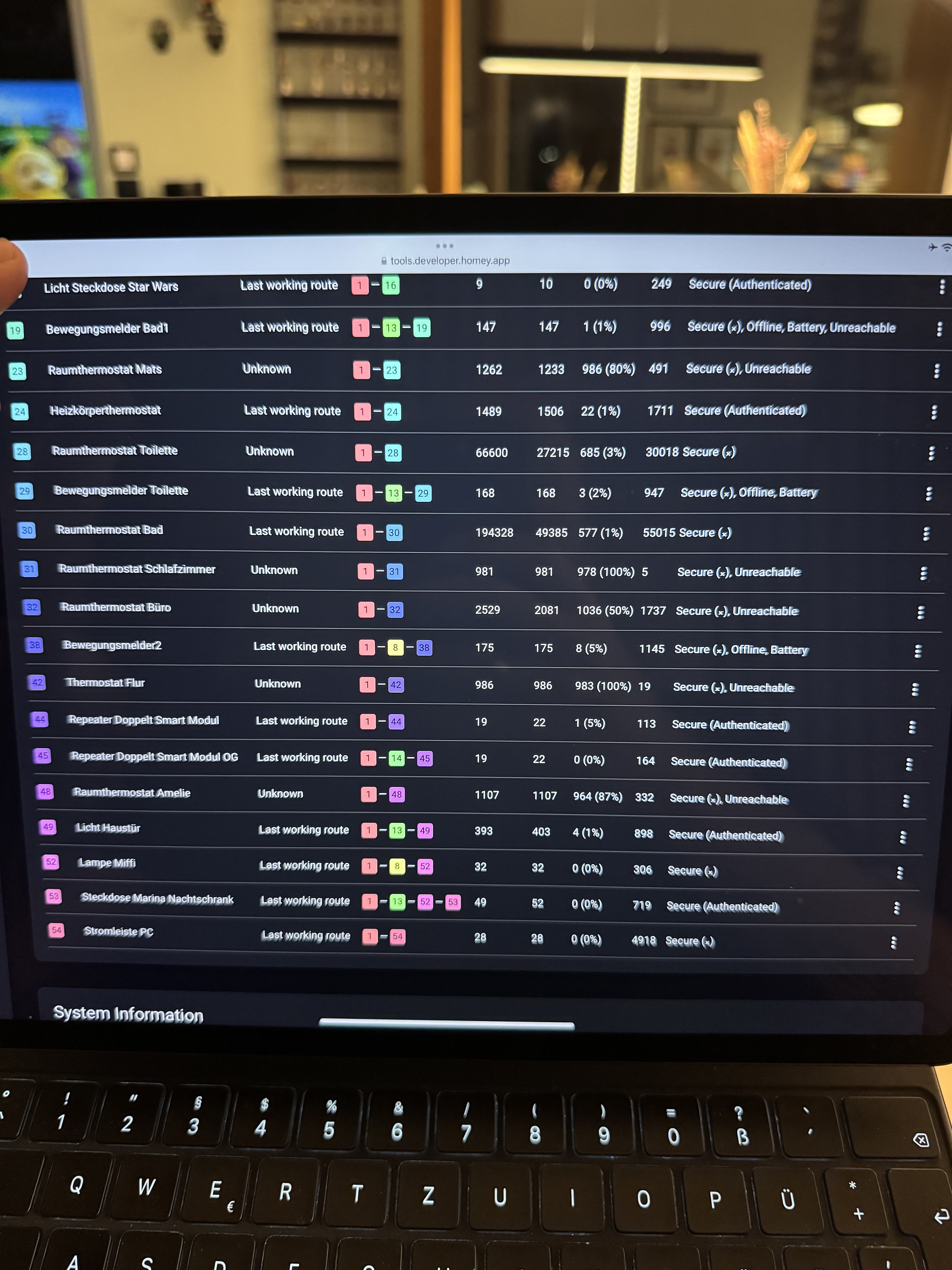 Tx Error bedeutet, dass z.B. 80 % (ID23: Raumthermostat Mats) der von Homey gesendeten Befehle das Thermostat nicht erreicht haben. Deshalb werden diese Thermostate auch als Unreachable gekennzeichnet.