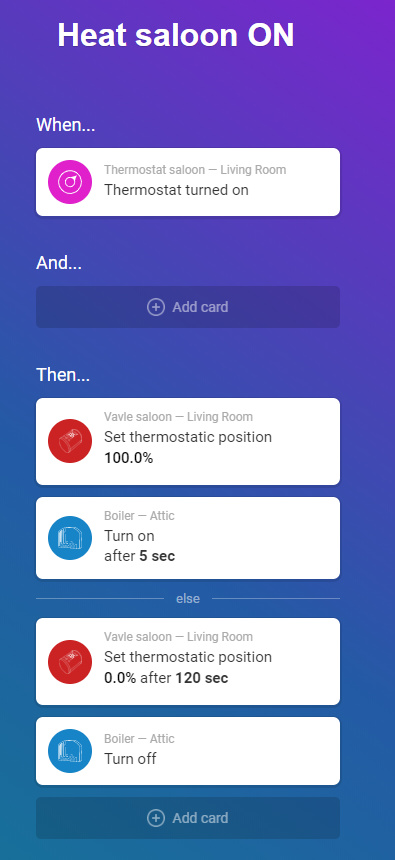 I discovered that “Thermostat turned on” trigger card is not the same as ''switched on":