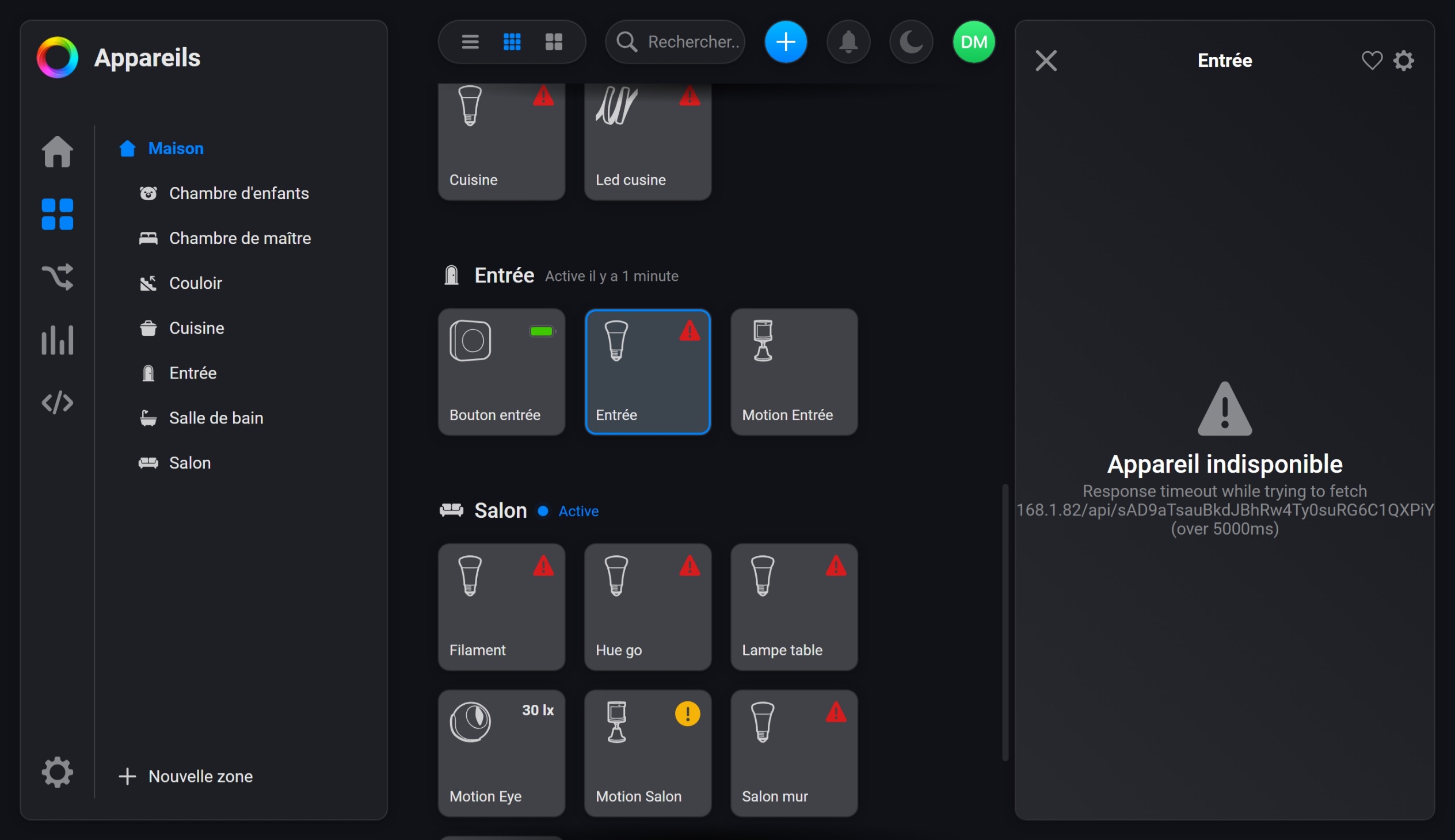 Et là, début des problèmes car plus de connexion avec mes lumières. Message d’erreur suivant :