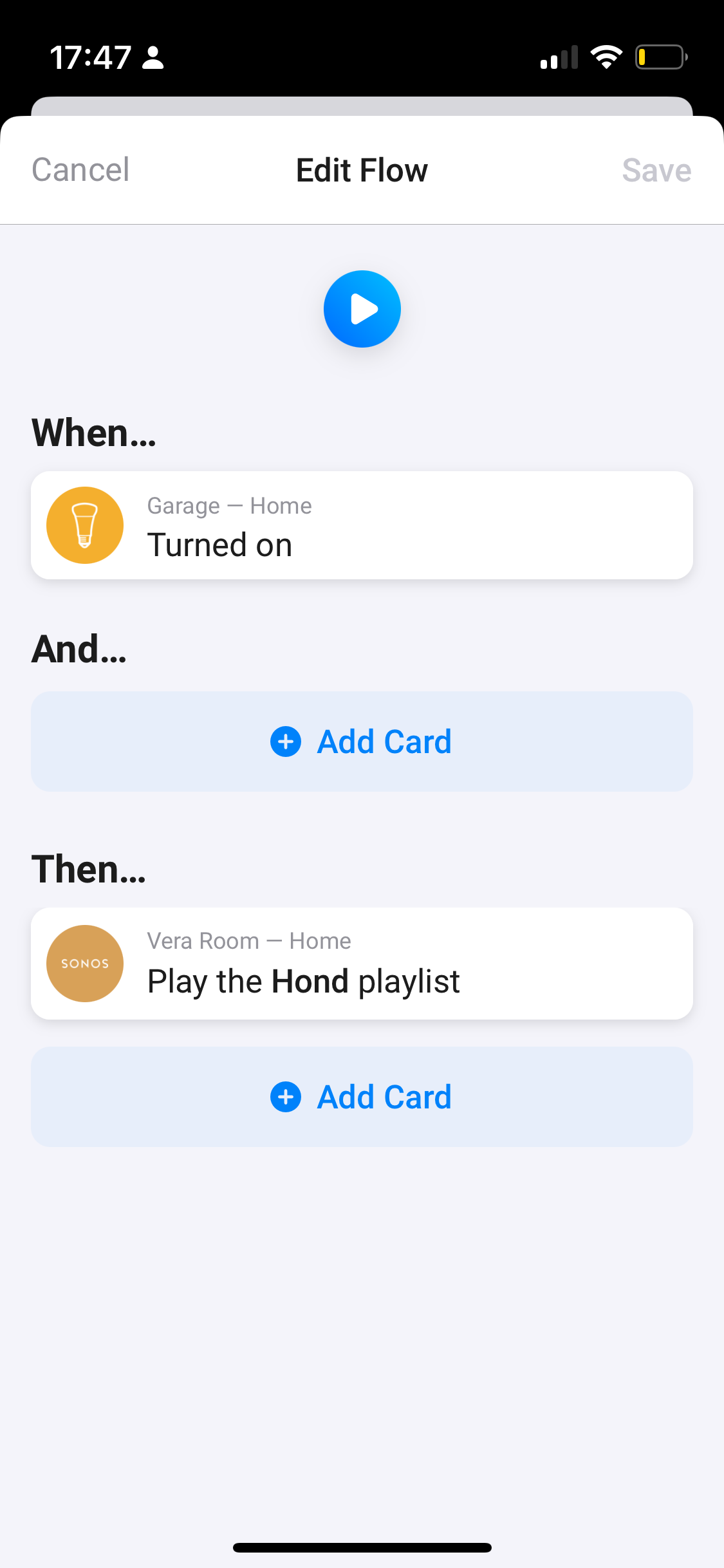 Als ik zelf op de flow tikt dan werkt het, echter als ik daarna langs de hue sensor lamp loop en deze gaat daarna netjes aan, start nog niet mijn muziek.