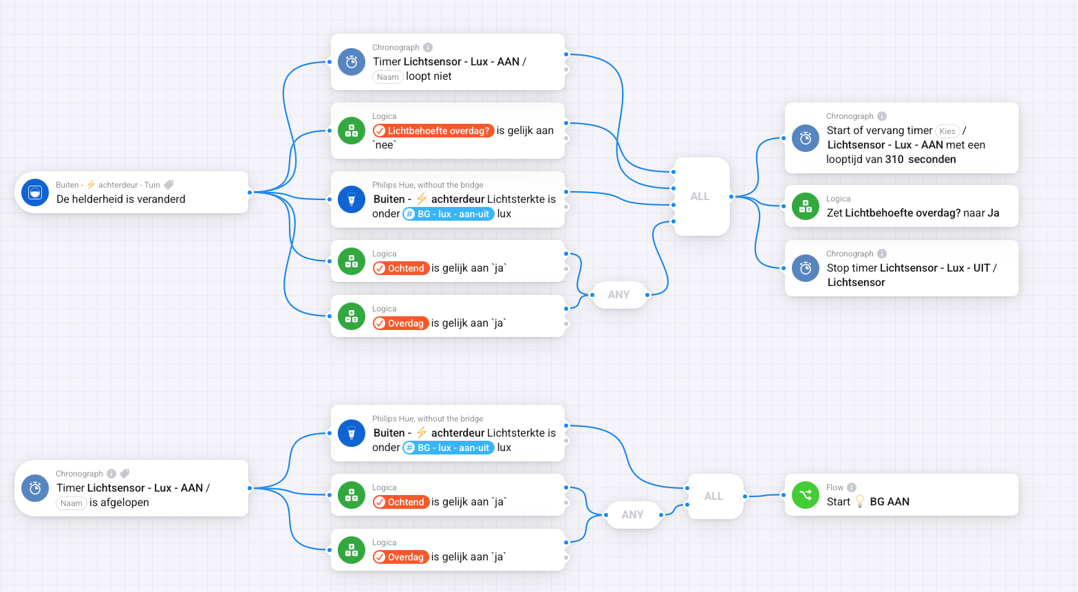 Chronograaf Timer: Gebruik ik om 2x in 5 minuten te controleren of de Lux waarde onder/boven een drempel zit, zo ja wordt aan die voorwaarde voldaan om de lampen in/uit te schakelen. Als de lichtsterkte onder waarde kaartje â#BG - lux -aan-uitâ komt wordt een timer gestart. Als de timer is afgelopen start flow 2, daarin zit opnieuw een check op de lichtsterkte en als die onder de waarde van het kaartje zit wordt de verlichting ingeschakeld.