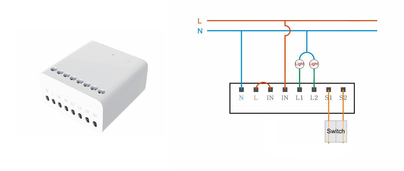 Let op dat jouw relais 2x IN heeft maar deze zijn doorverbonden en dus de Common voor de beide schakelkontakten L1 en L2 .