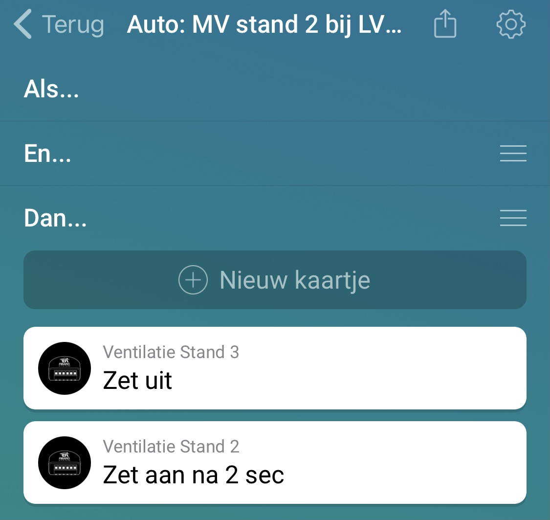In de eerste flow (bij wijziging van de luchtvochtigheid) gaat hij naar stand 2 als de waarde <65% is. Daarnaast gaat hij na een uur altijd weer van stand 3 naar 2. Een andere flow zet hem van 2 naar 1 na een half uur.