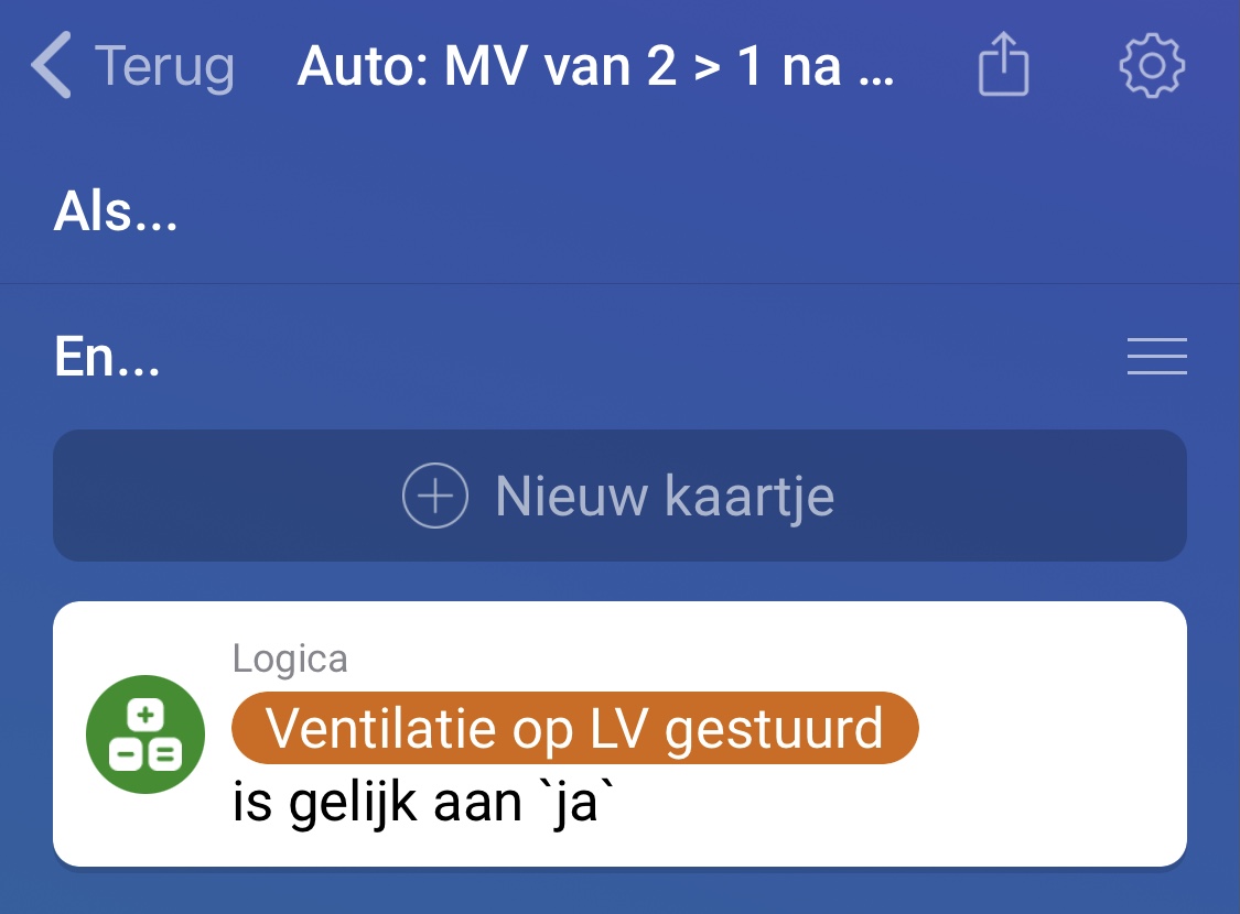 Ik zet ook nog een boolean variabele om in de vervolg flows onderscheid te kunnen zien tussen de automatisch sturing op basis van luchtvochtigheid of handmatige met de 3 standen schakelaar in de keuken.