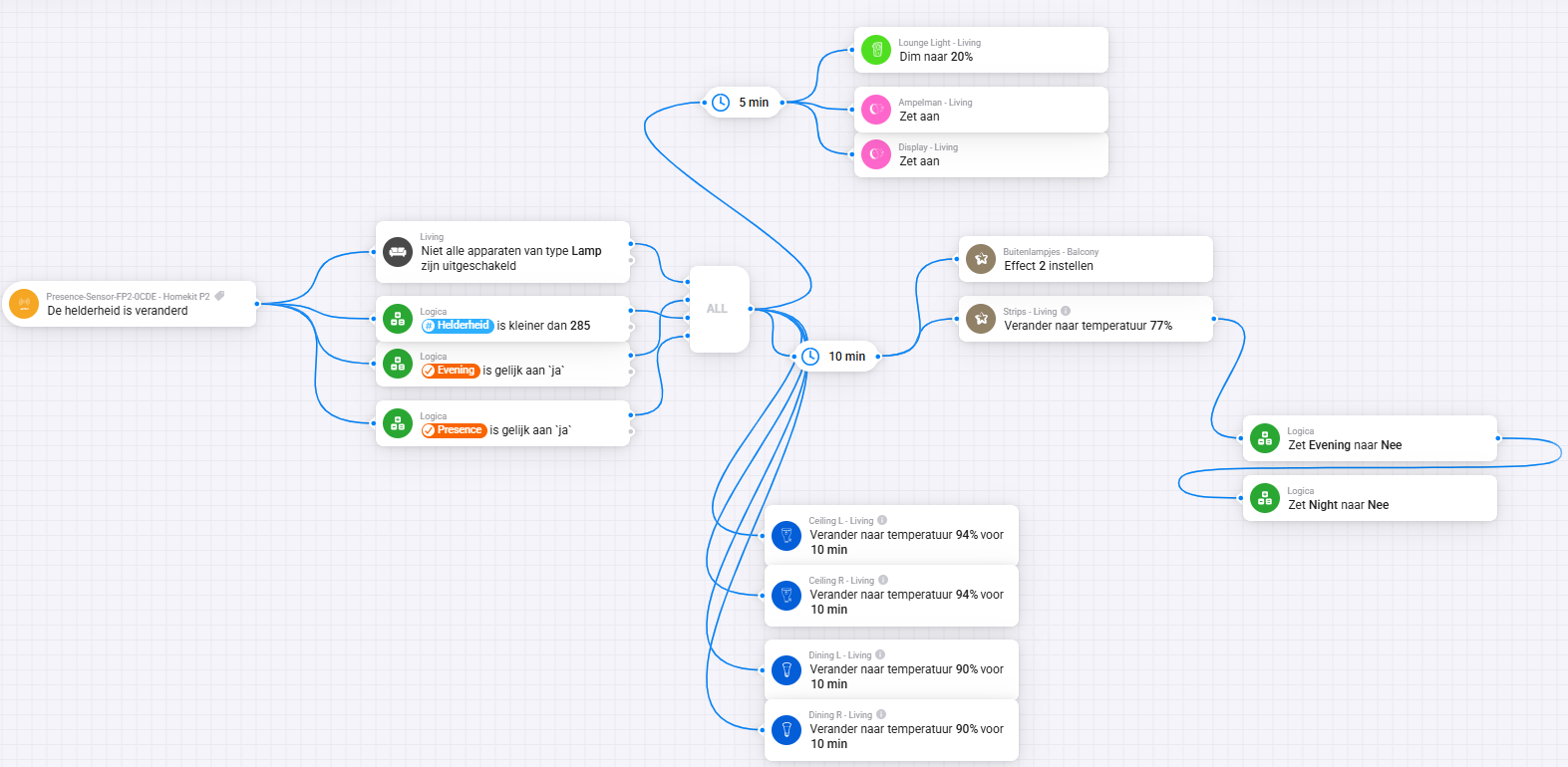 Ik heb zoiets voor mn verlichting in woonkamer en keuken. Ik werk met een luxmeter die buiten hangt en eentje in de keuken. Mn keuken verlichting gaat aan onder een bepaalde lux (keuken) en bij beweging. Woonkamer gaat savonds aan mbv de lux meter buiten, eerst dimmen van 1% naar 30% in een koelere kleur over een bepaalde tijd. Bij lagere lux gaat ie over naar een warmere kleur en schakelt meer verlichting aan