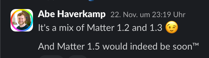 Welche Matter Version aktuell vom Homey unterstützt wird, ist in der Tat nicht eindeutig. Lt. Aussage eines Mitarbeiters von Athom auf Slack ist es ein Mix aus Matter v1.2 + v1.3: