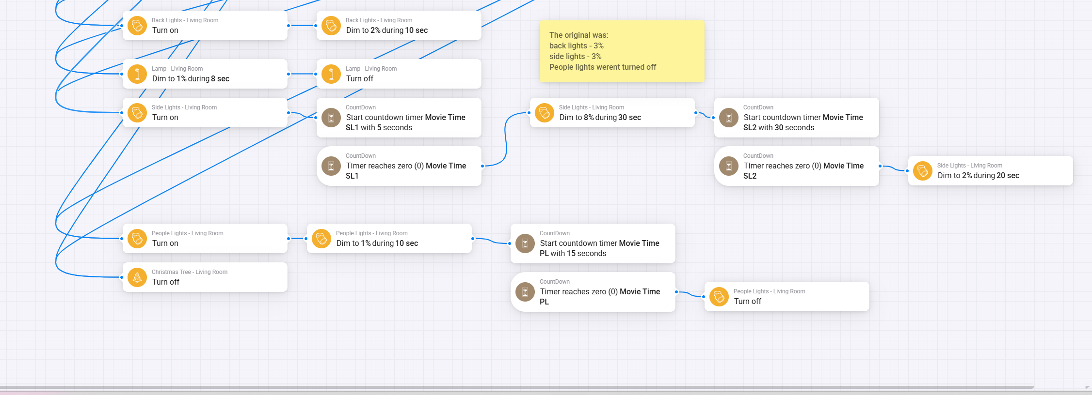 I use Alexa to trigger them, so for example when I say “Alexa, its movie time” the lights don’t all just turn off instantly, instead they fade to black over a period of 50 seconds, but different lighting groups do it at different speeds.