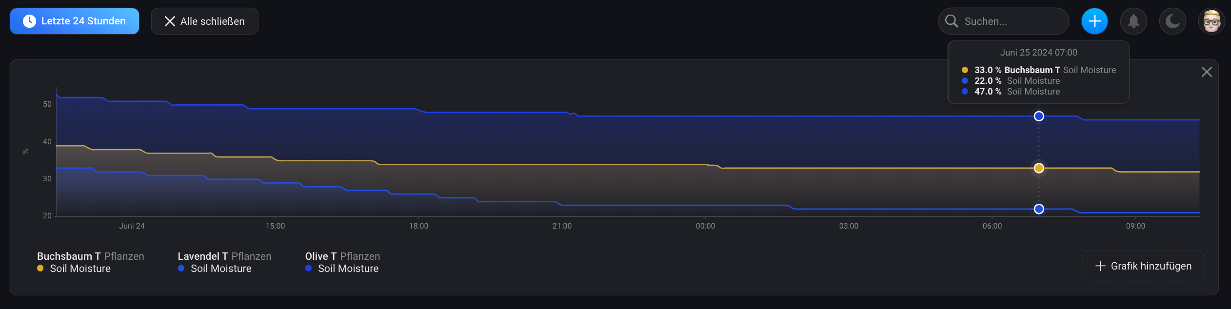 Hier der Verlauf der drei Sensoren für die letzten 6 Stunden. Erkennbar ist, dass ab 07.00 Uhr die Feuchtigkeit der Hecke auf 40 Prozent gesunken ist.