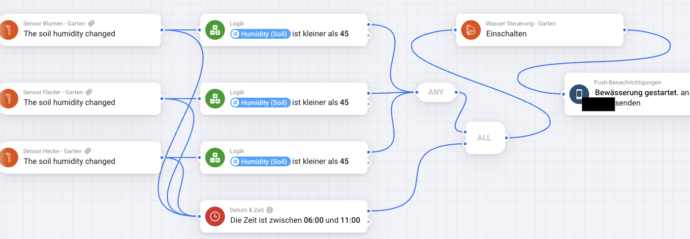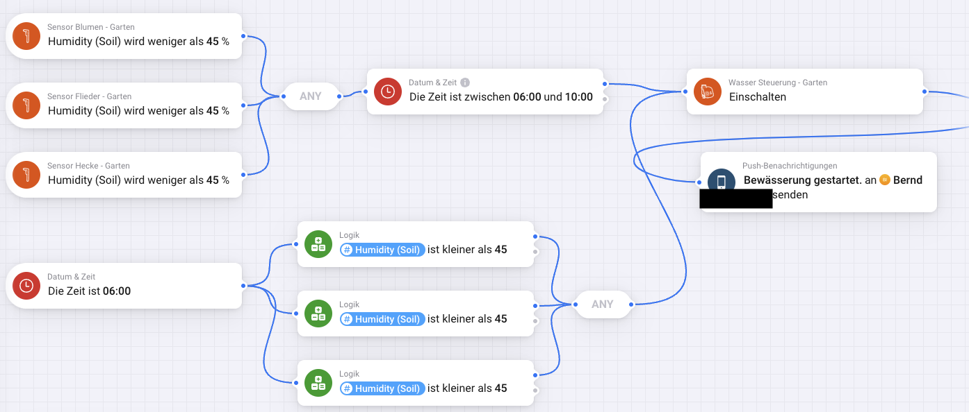 ich habe drei Bodensensoren von Gardena im Garten. Dazu habe ich einen Flow erstellt, der auch funktioniert. Sollte die Bodenfeuchte am Morgen zwischen 07.00 Uhr und 10.00 Uhr bei einem der Sensoren unter 45 Prozent sinken, dann wird die Bewässerung (Tröpfchenschlauch) für eine Stunde automatisch gestartet.