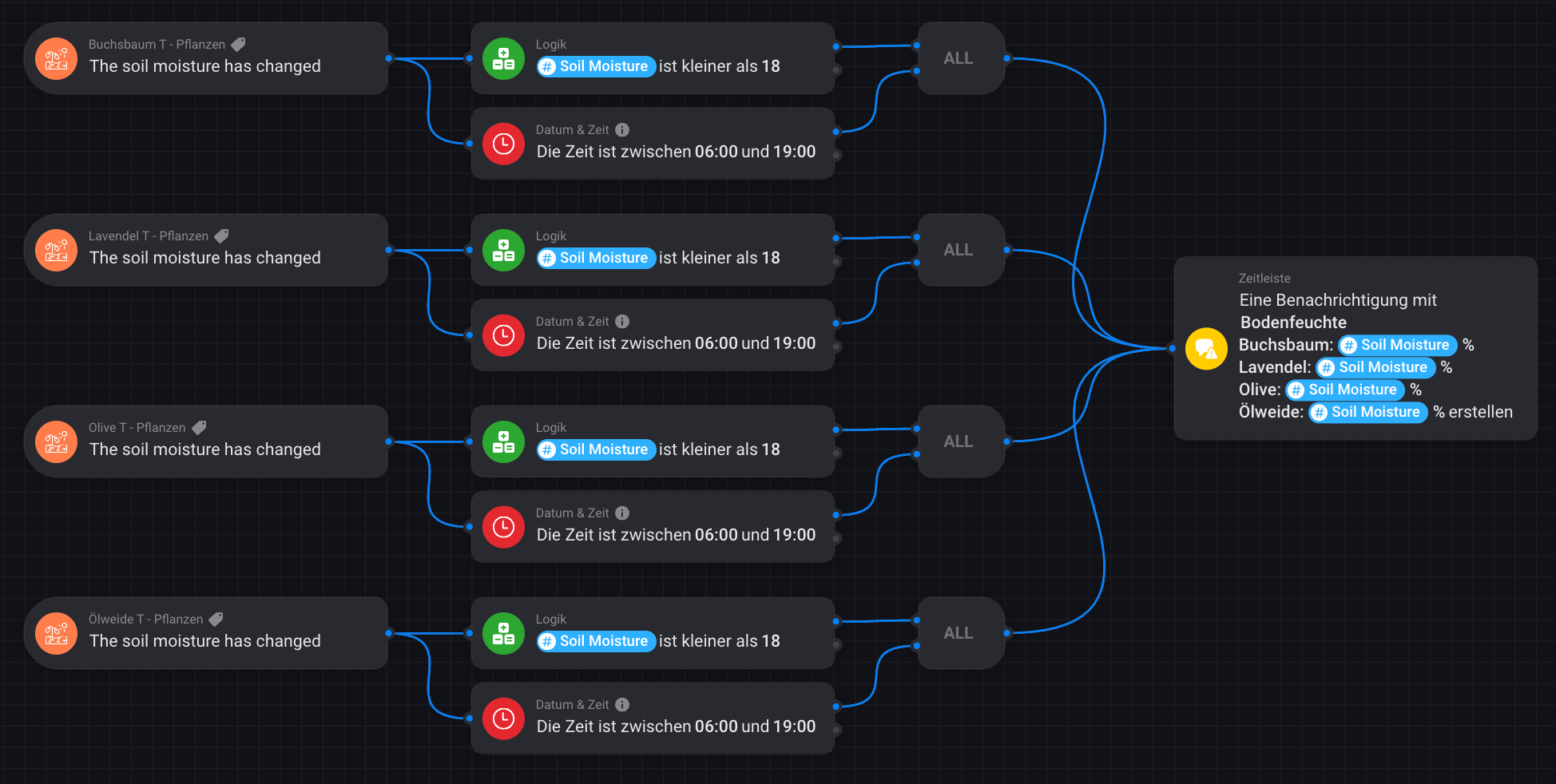 – Du hast 2 der 3 Logik-Karten inkl. (# Humidity (Soil)) Tag kopiert. Demnach würde die Überprüfung der Feuchtigkeit nur an einer Pflanze durchgeführt werden
