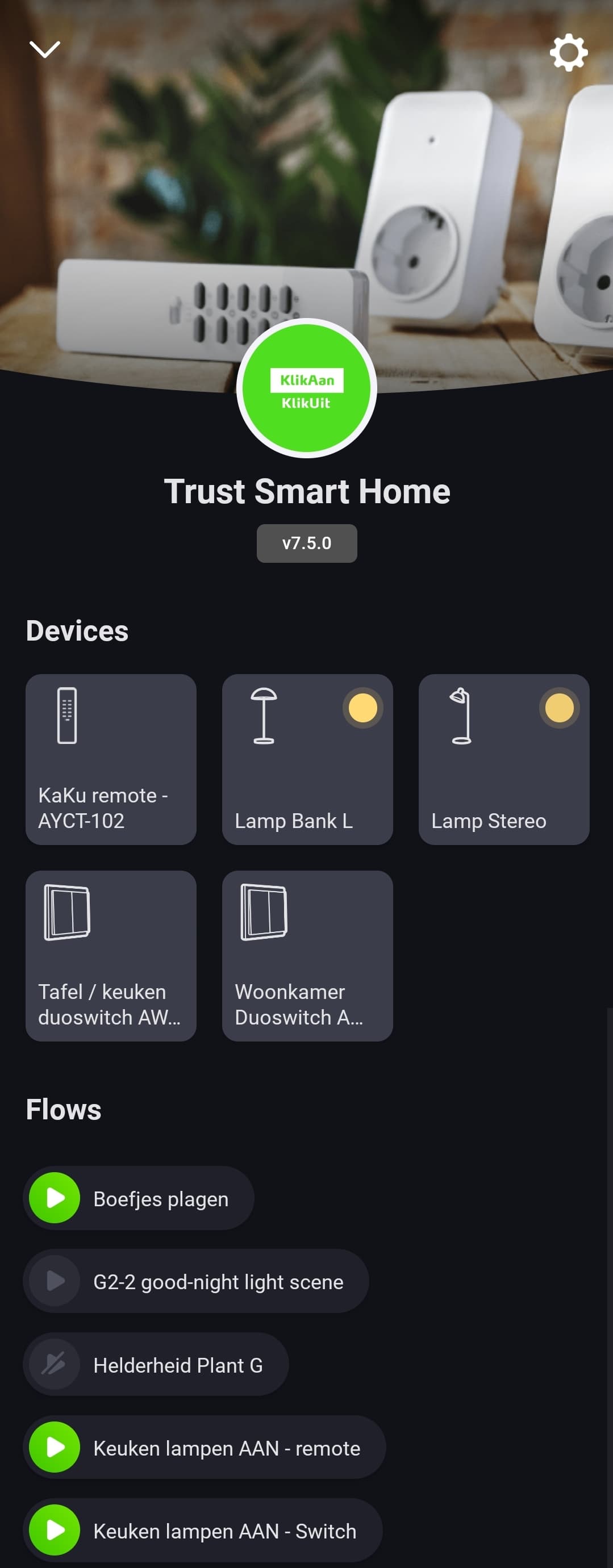 Zie je in de mobiele app, bij de Trust Smart Home app geen βrareβ flows staan misschien?