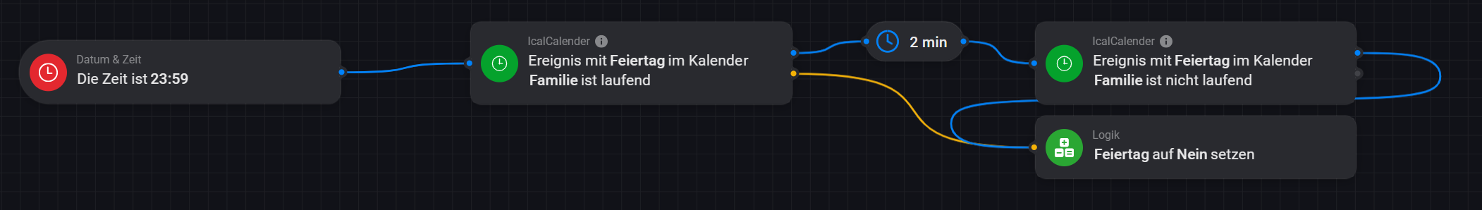 Dein Kalender schaltet mit Hilfe der Feiertag ical, die Variable um 23:59 des Feiertages auf ja.