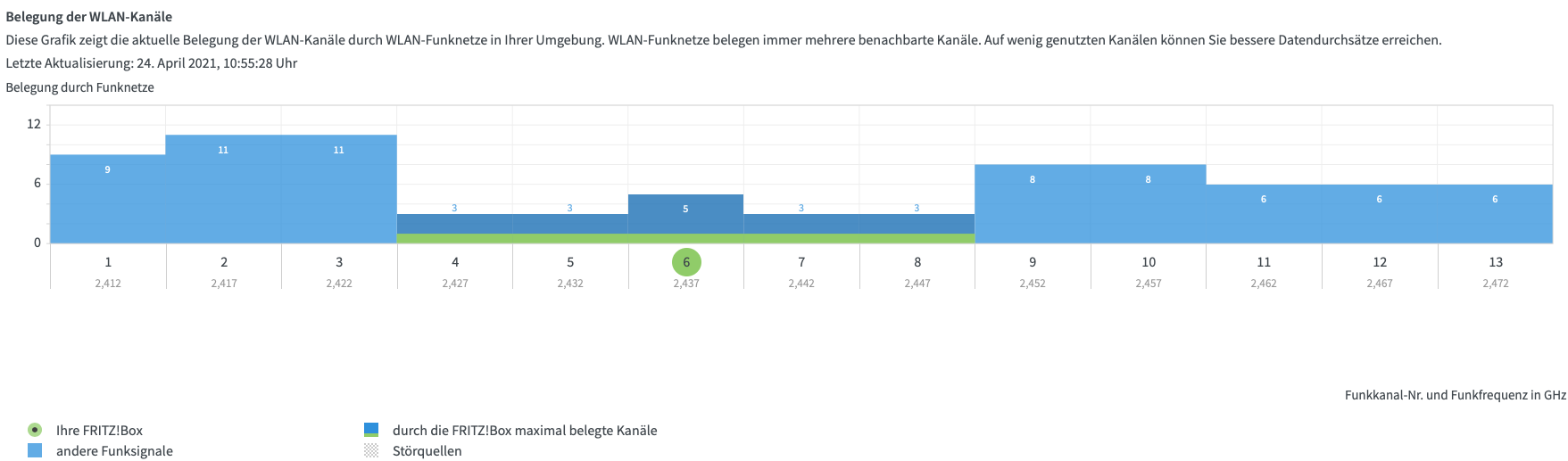 Hi, also wenn ich recht sehe habe ich Kanal 14 eingestellt oder? Mein WLAN ist auf 6. Anbei noch Screenshots aus der Fritzbox was hier rundherum so abgeht…