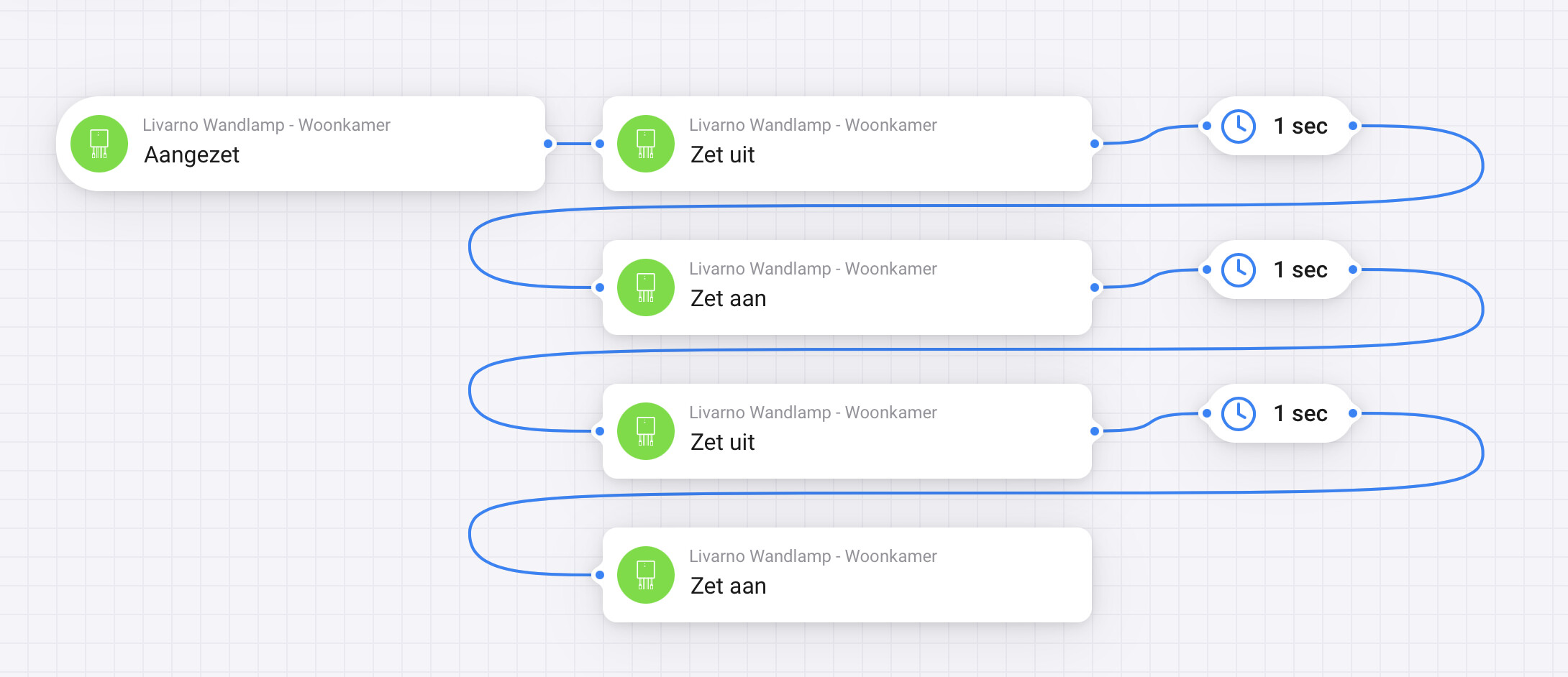 Ik zie in ieder geval een inconsistentie in je flow. Tussen het eerste aanzetten (“Aangezet”) en de eerste keer “Zet uit” zit geen wachttijd van een seconde. Misschien zit daarin een probleem. Ofwel alles op eenzelfde wachttijd zetten of in het geheel geen wachttijd gebruiken zou mijn gedachte zijn.