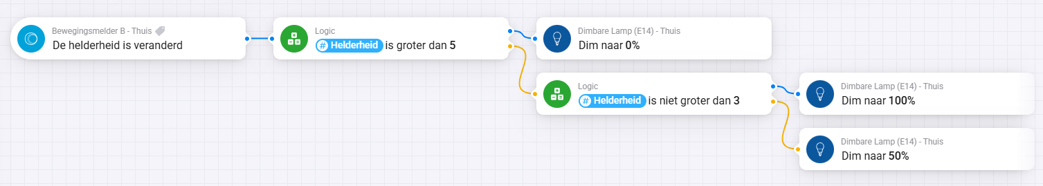 Als je de lampen met met de Hue tap op bv 90% zet, kun je met een Logica kaart testen of the tag “dim level” groter of gelijk 90 is. En de flow(s) alleen vervolgen als dat niét het geval is.