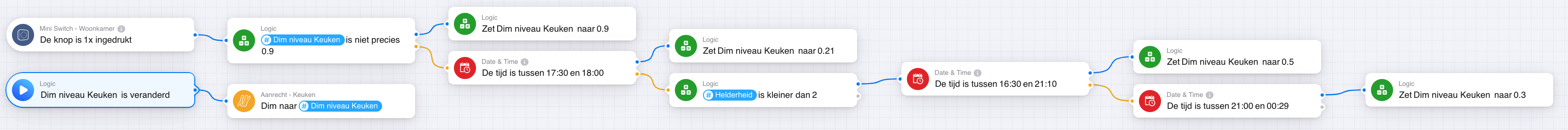iemand een oplossin voor mijn 2de probleem? lichten staan gedimt tussen 21.00 en 0.00 maar ik wil met de HUE knop aan de muur het dim niveau hoger zetten. dit kan maar na een korte periode dimt hij het licht weer omdat de flow dat doet. wat is handig de knop programmeren dat als ik de knop indruk de flow wordt uitgezet? of wat ik ook lees een virteel apparaat aanmaken maar dat begrijp ik niet helemaal?!?!