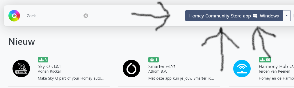 De Homey Community Store app op je Homey is niet gevonden. Hierdoor is het niet mogelijk om apps te installeren. Je kan de Homey Community Store app downloading in de navigatiebalk.