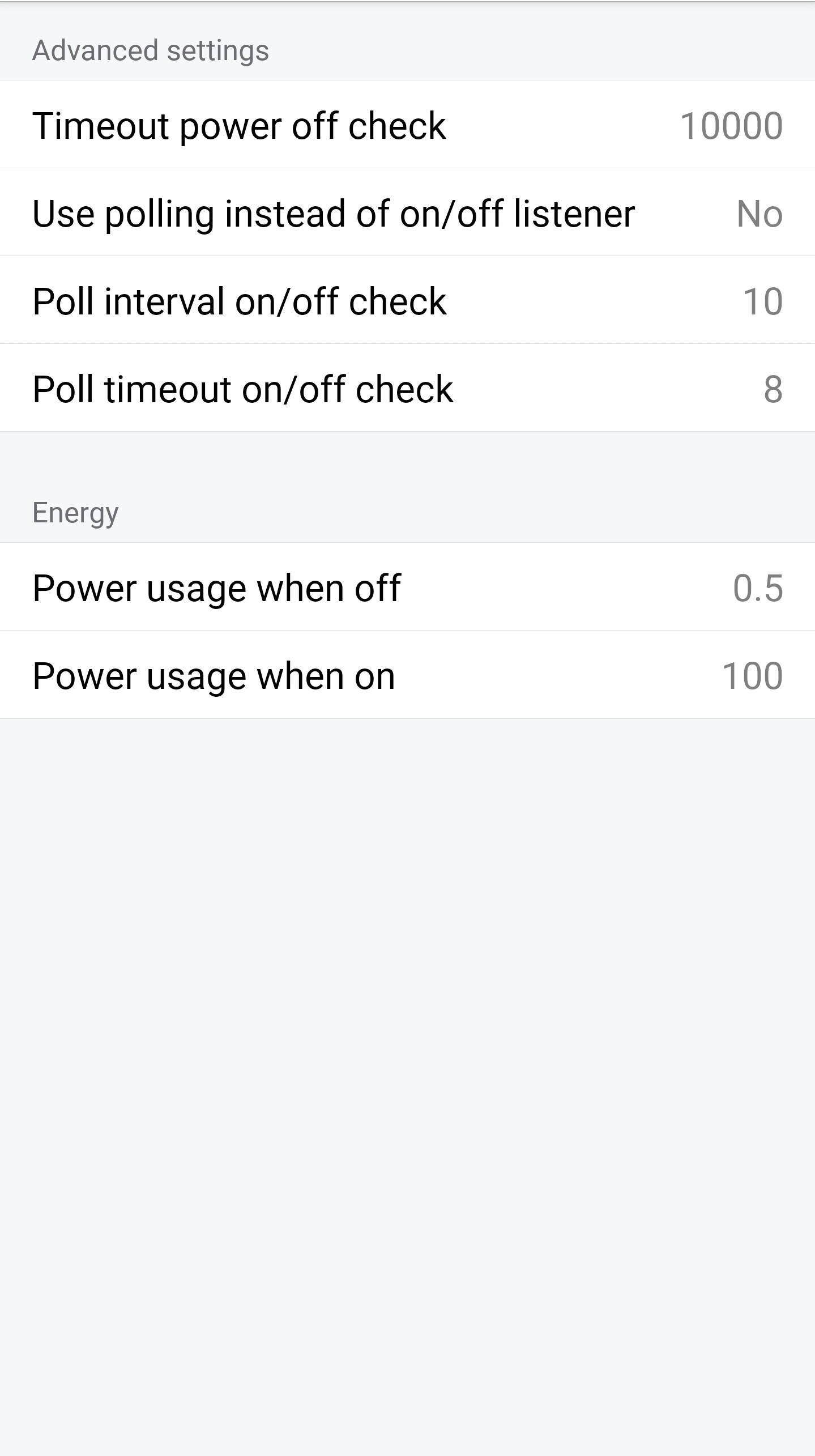 The Poll interval on/off check is simply the interval the app will poll. So in the default case it will check if the TV is on/off every 10 seconds and it will give the TV 8 seconds (Poll timeout on/off check) to tell it’s alive, else it’s dead so it’s turned off. The Poll timeout should never be higher than the Poll interval. You can play with these two parameters to find the perfect settings for you. It might be possible that due to a slow network or just slow TV the TV needs more than 8 seconds to respond to a poll. So I would suggest to start with a poll interval of 30 seconds and give the TV 20 seconds to reply. If that works, just try to lower the values until you find the sweet spot.