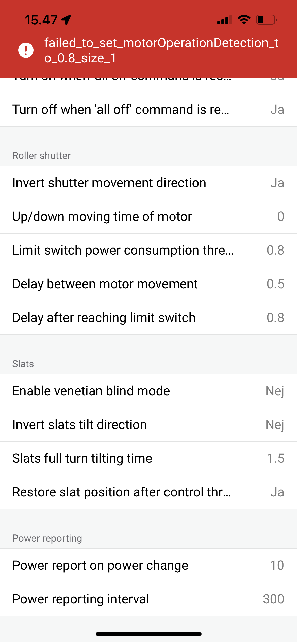 The limit power switch consumption: When I try a change / increase it, it returns an error “Failed_to_set_motorOperationDetection_t_o_0.8_size_1” And this error is returned on any value I try. it will only accept 0.6 (the standard value)