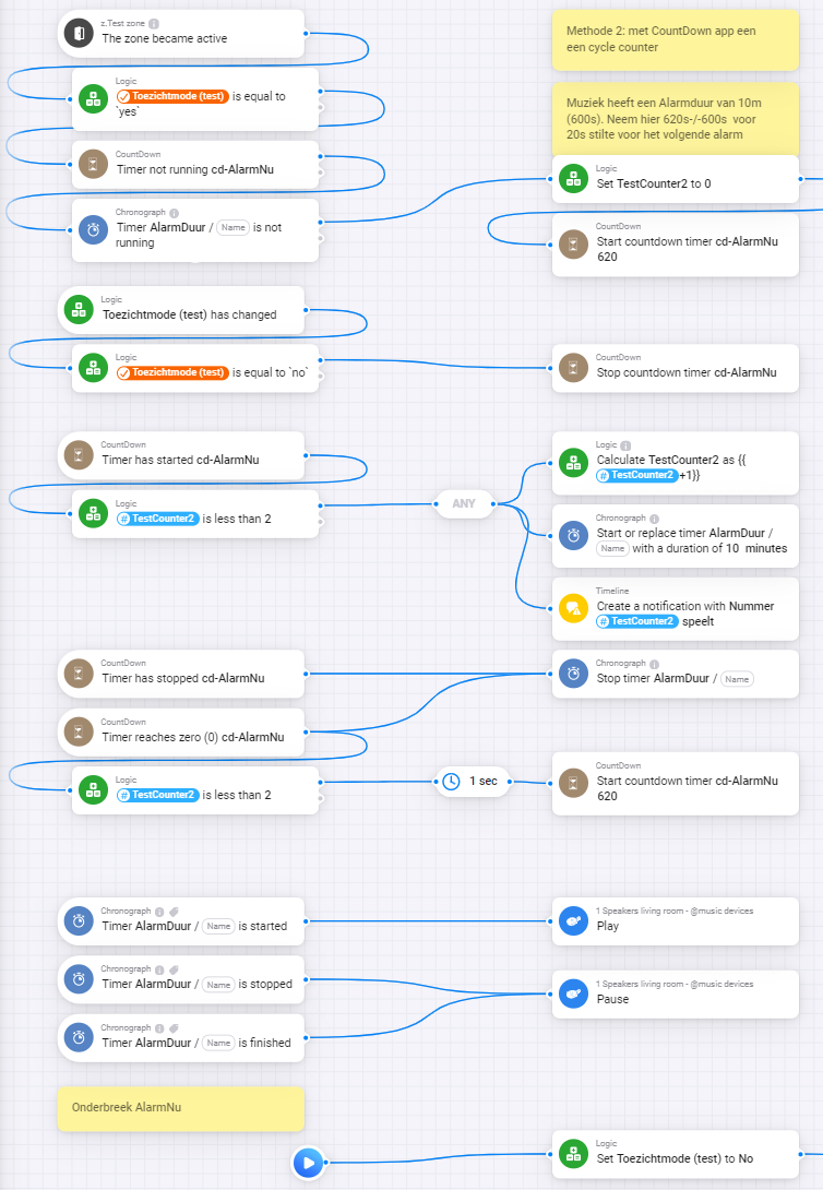 Daar je specifiek wil dat het alarmsignaal 2x afspeelt heb je een teller nodig met een startnummer en een eindnummer.