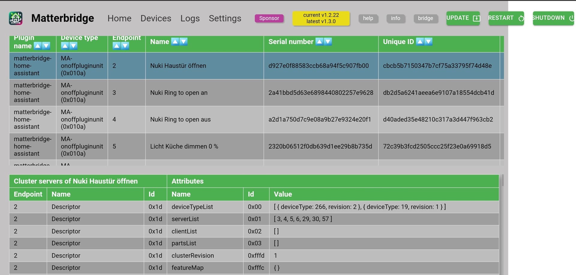 Es handelt sich hierbei um ein Programm, dass im Docker Container unter HA installiert wird. Diese Erweiterung zeichnet sich dadurch aus, dass alle unter HA installierten Geräte, als Matter Geräte zur Verfügung stehen sollen. Das wäre sehr praktisch und ich musste das testen. Die HA Erweiterung ist innerhalb von 30 Sekunden installiert und startet sofort. Es werden tatsächlich alle meine HA Geräte angezeigt und unter Matter bereit gestellt: