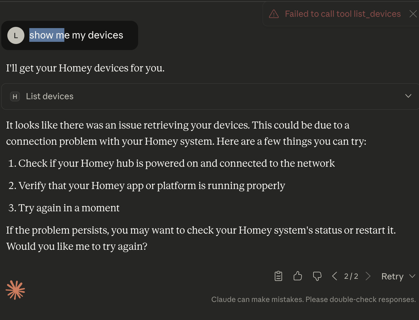 I installed Your app on Homey by CLI method. I have node js. I created API token with all boxes checked. Configured config file of Claude with my IP and TOKEN but whet I try some command Claude saying “I don’t have access to information about your bedroom’s temperature. I can’t connect to smart home devices, thermostats, or sensors in your space.”