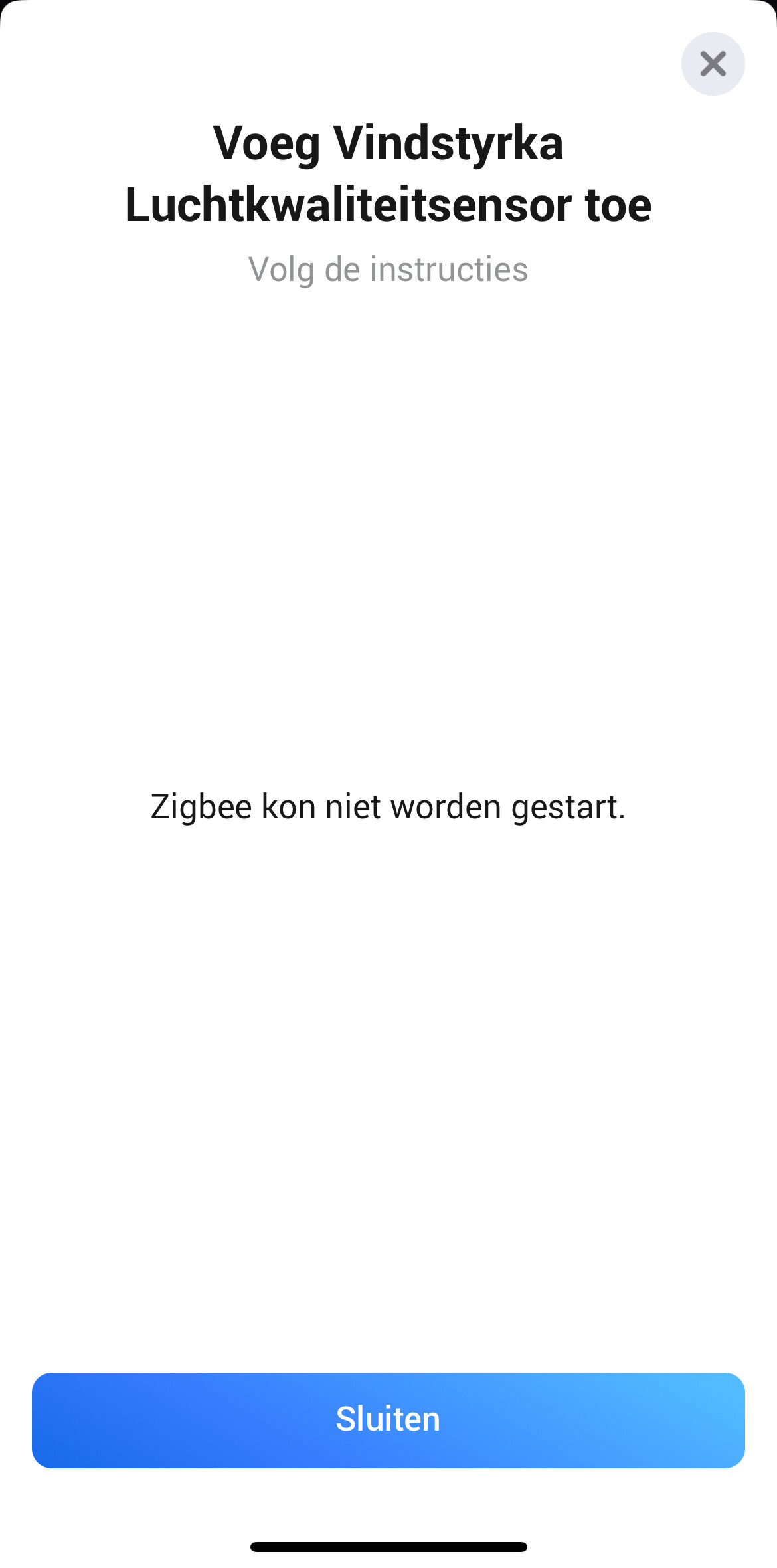 Ik heb de Homey na de Zigbee reset op nieuw opgestart, mogelijk lost dit het probleem op, maar dat is ook niet het geval. En als ik een nieuw Zigbee apparaten wil toevoegen krijg ik onderstaande melding: