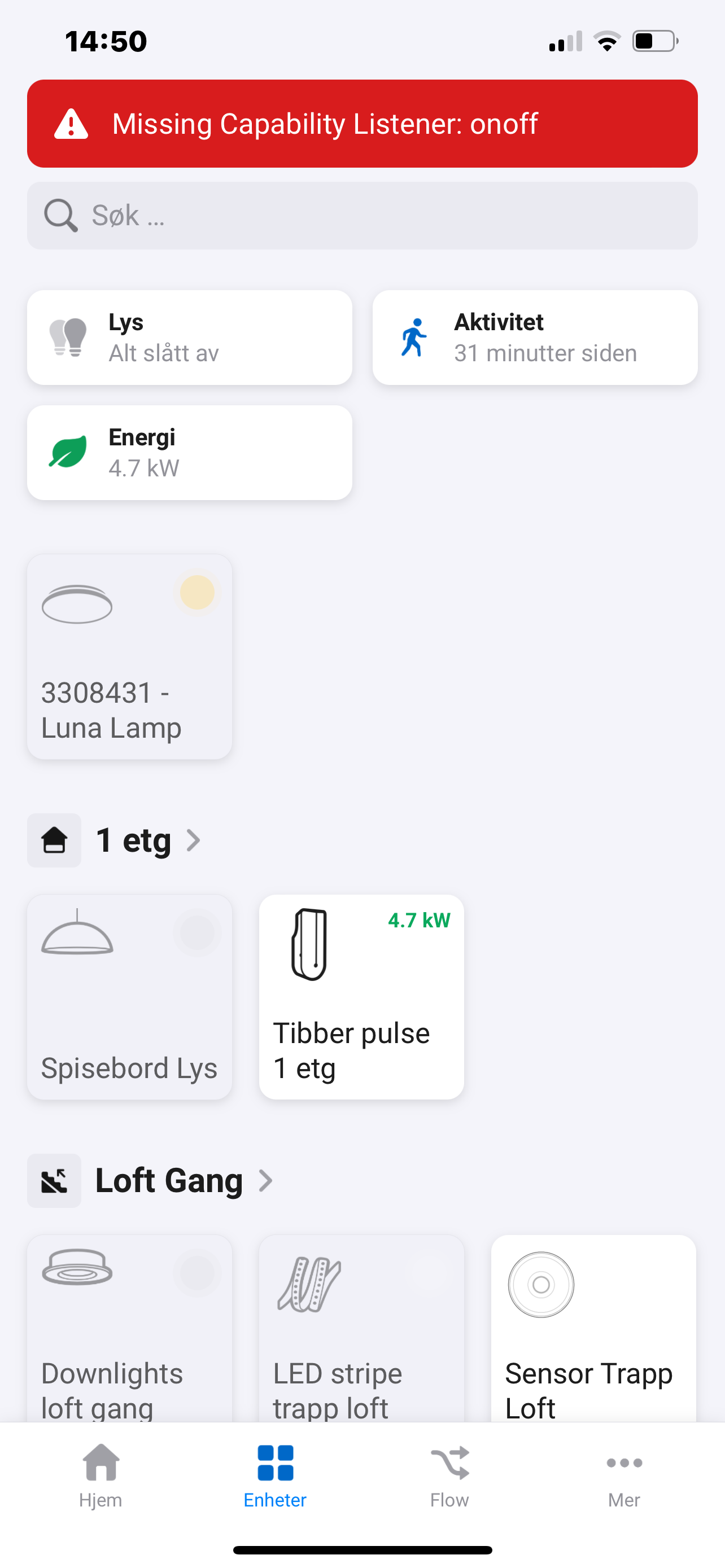 I get an error message when trying to control the luna lamp through the homey app. It says that the device is connected but get an error of: «missing capability listener: on/off»