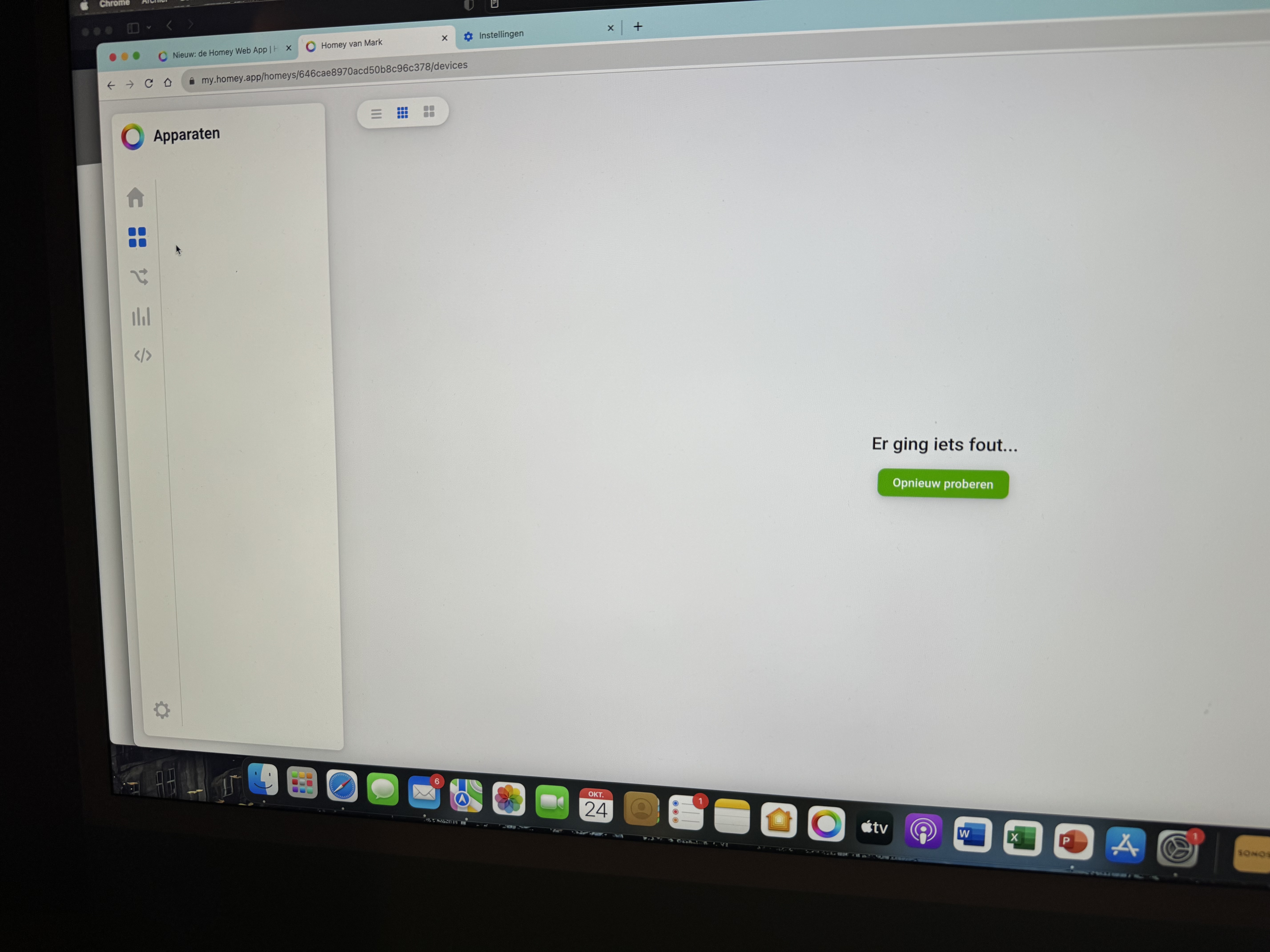 For several weeks now I have been experiencing problems with finding devices in the mobile app (some devices are missing) and in the web application I can no longer open the menu with devices and flows at all. I get the message ‘an error has occurred’ in Google Chrome or the interface just freezes in Safari. I think the problem began