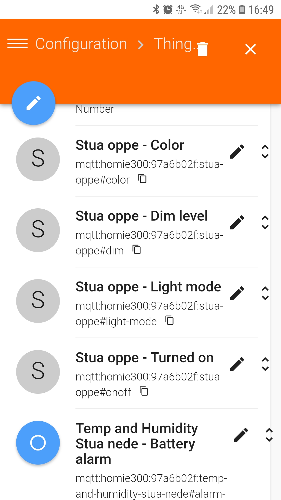 "when freshly added all devices work until OpenHab is restarted at which point all my temperature reports go to NaN and stay that way despite normal MQTT traffic. I have noticed however, that the “control” channels still work, so toggling switches in OpenHab sends out the required MQTT command, and the Homie devices respond - but my temperatures and configuration “readback” that the Homie devices transmit periodically are ignored.