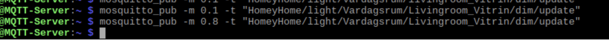 Mosquitto_pub -m ”0.5” -t ”HomeyHome/light/Livingroom/Livingroom Vitrin/dim/update”