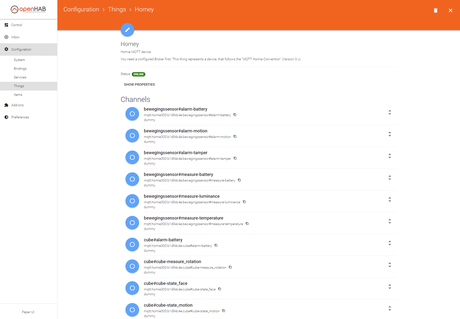 All devices and their properties (+datatypes) are automatically detected and imported via the Homie Convention: