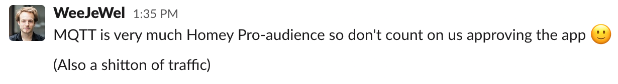 I’m using mqtt to feed my grafana dashboard from multiple devices. I also want to add a couple of homey devices via mqtt. I’ve installed the mqtt app and I’m using mosquitto as external broker. If I read the instruction I see: