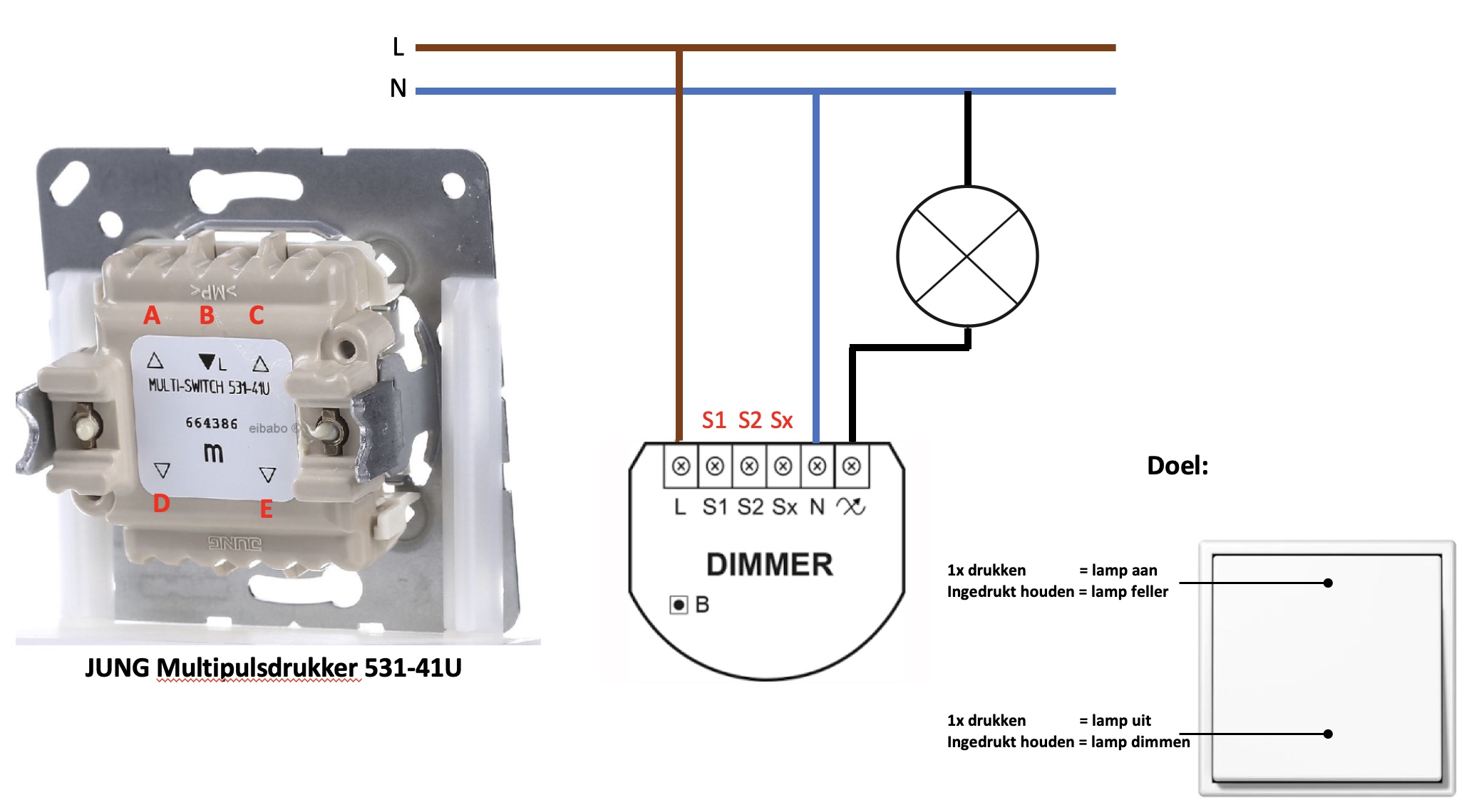 Ik heb een Jung Multipulsdrukker enkel (531-41U) welke ik via de Fibaro Dimmer 2 domme verlichting wil laten aansturen. Daarover heb ik 3 vragen:
