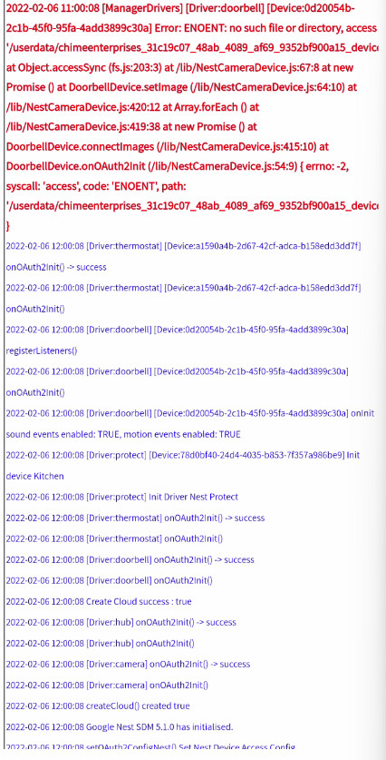 2022-02-07 20:40:17 [ManagerDrivers] [Driver:doorbell] [Device:f9ae0bca-e437-4d08-918b-fea98b4f0a5a] Error: ENOENT: no such file or directory, access ‘/userdata/chimeenterprises_31c19c07_48ab_4089_af69_9352bf900a15_devices_avphwevgbdh5rhhssug2jm_a2wm6hw6xel3igcccgg0ul46anx_gsp0ts1jvbvlcooojaqz3miwc2ha5bfnazw7omoxtzq.nst’ at Object.accessSync (fs.js:203:3) at /lib/NestCameraDevice.js:67:8 at new Promise () at DoorbellDevice.setImage (/lib/NestCameraDevice.js:64:10) at /lib/NestCameraDevice.js:420:12 at Array.forEach () at /lib/NestCameraDevice.js:419:38 at new Promise () at DoorbellDevice.connectImages (/lib/NestCameraDevice.js:415:10) at DoorbellDevice.onOAuth2Init (/lib/NestCameraDevice.js:54:9) { errno: -2, syscall: ‘access’, code: ‘ENOENT’, path: ‘/userdata/chimeenterprises_31c19c07_48ab_4089_af69_9352bf900a15_devices_avphwevgbdh5rhhssug2jm_a2wm6hw6xel3igcccgg0ul46anx_gsp0ts1jvbvlcooojaqz3miwc2ha5bfnazw7omoxtzq.nst’ }