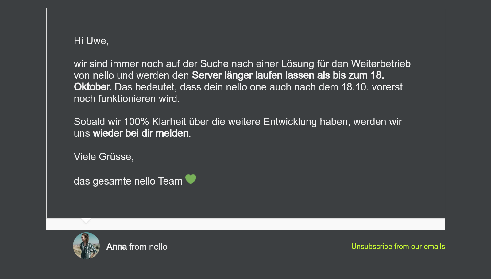 Du bleibst damit Herr Deiner Daten. Und eine einmal erklärte Zustimmung kann von Dir natürlich auch jederzeit – mit Wirkung für die Zukunft – widerrufen werden. Aber wir hoffen natürlich, dass Du uns als begeisterter nello-Nutzer erhalten bleibst und auch in Zukunft den Weg gemeinsam mit uns beschreitest.