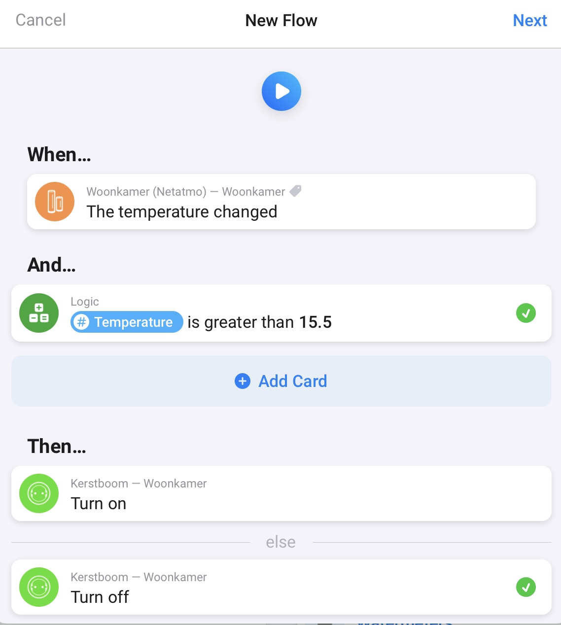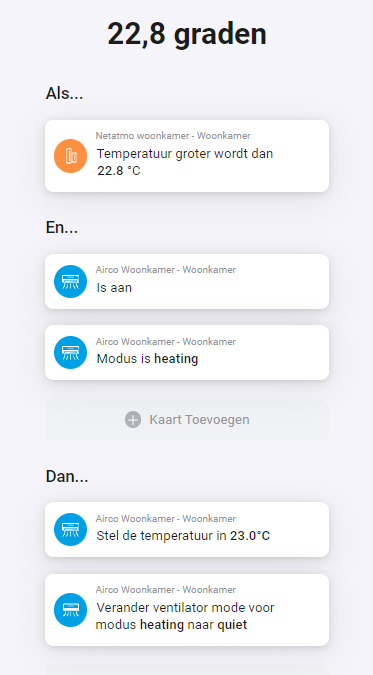 In de woonkamer gebruik ik het basis station als temperatuur sensor. Daar heb ik ook een Airco hangen van Daikin met een wifi module. Nu heb ik een flow geschreven met wat waardes er in met de kaart van Netatmo als de temp…groter is dan… moet de airco naar een stand lager gaan. De Netatmo app is vrij nauwkeurig maar de verniewings frequentie vanuit Homey naar het Netatmo basis station duurt 20 minuten. De Netatmo app geeft bv een binnen temp van 24 graden aan, omdat de airco niet het signaal krijgt van Homey dat deze de temperatuur heeft bereikt, want dan staat bv het basis station in Homey nog op een temp van 22,3 met als laatse meeting 12 minuten geleden. Hoe kan ik vernieuwings frequentie versnellen, of liever nog, realtime maken? Heel graag jullie antwoorden want ik heb daar dus een vrij duur systeem voor aangeschaft omdat Netatmo het best met Homy zou werken. Alvast bedankt voor het meedenken en jullie adviezen/reacties.