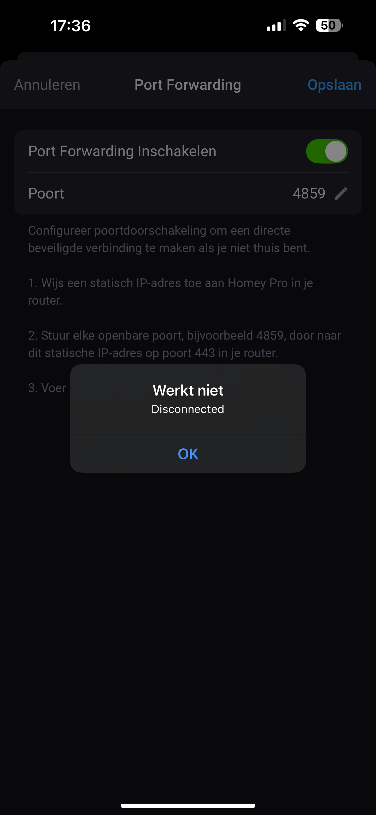 Helaas, thuis aangekomen de router etc weer gereset, ik heb gekeken naar mijn externe IP en deze lijkt niet onder het eerder gedeelde CGNAT verhaal te vallen. Na inpluggen komt de homey “online”, ik zie hem in de router, ook in de app maar kan geen cloud verbinding maken, kan ook niet port forwarding activeren…
