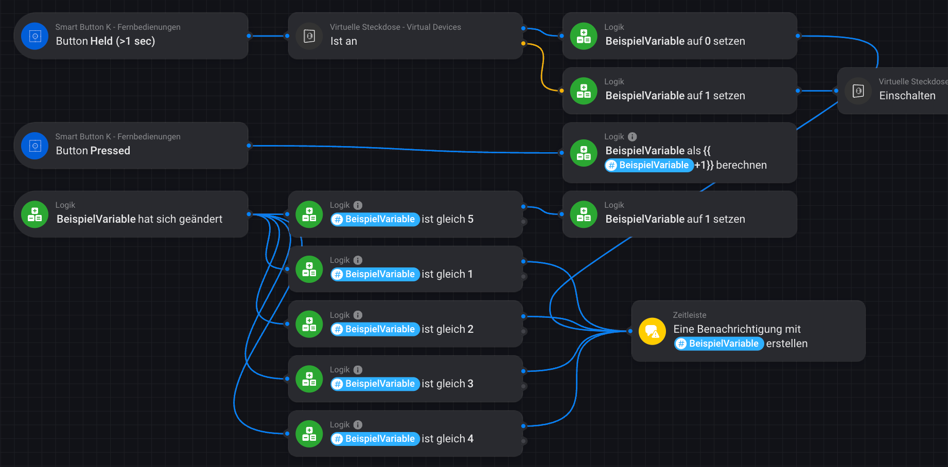 Wird die Taste Start/Stopp gedrückt, wird eine numerische Variable entweder auf 0 oder 1 gesetzt, abhängig davon, ob der Sonos spielt oder nicht. Wird nichts abgespielt, wird die Variable auf 1 gesetzt und damit der erste Radiosender (Sonos Favorit) gestartet. Das funktioniert auch nach wie vor, auch das Stoppen bzw. Pausieren.