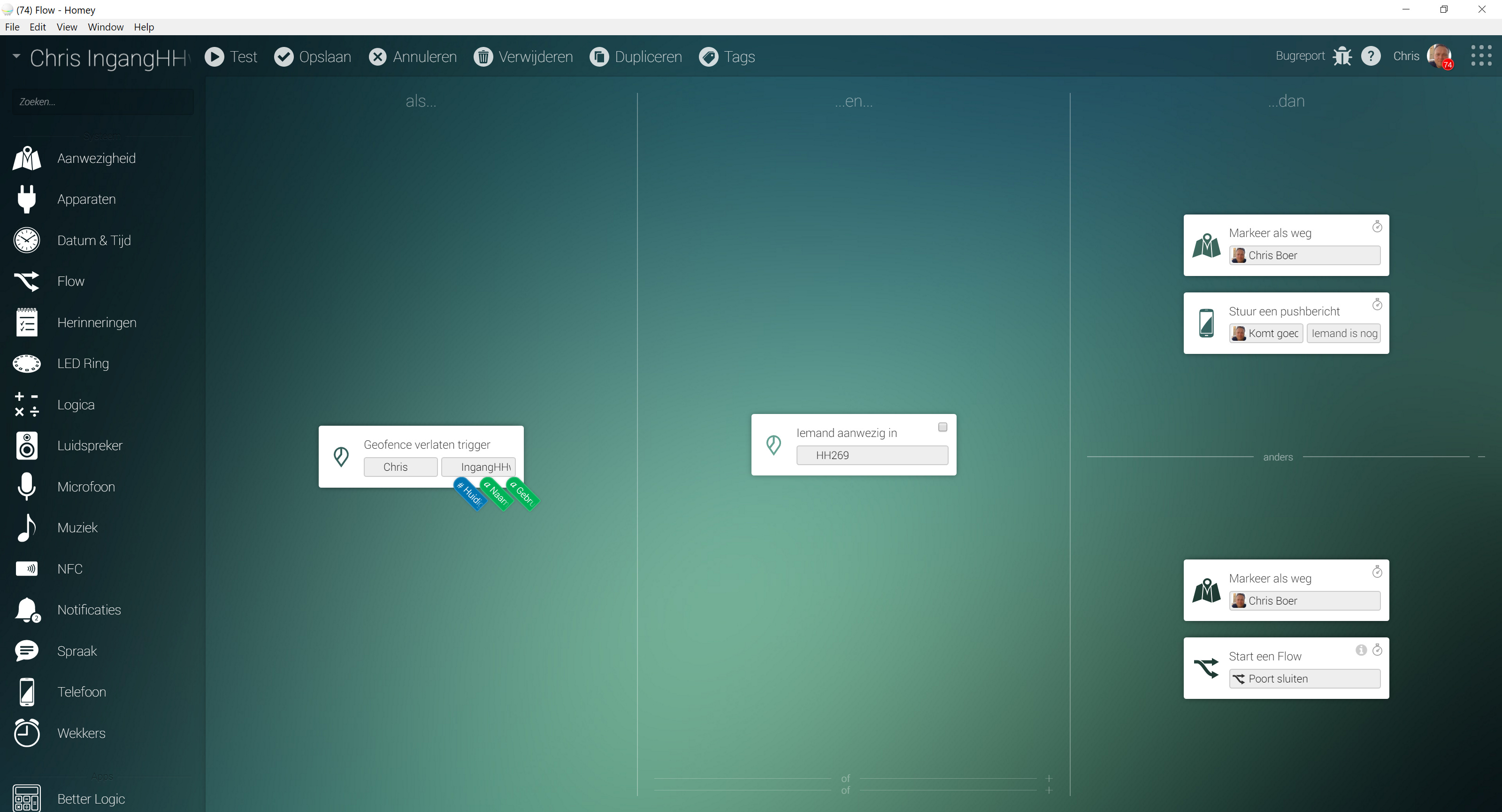In the flows above i see the name of the household members. in my case i don’t see anything. My question is do i have to add users and geofences in the Homey app section?