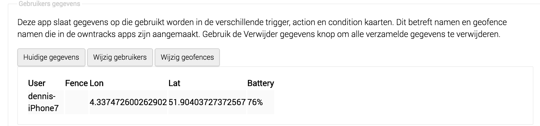 today i have tried what the app does and it works at least in the app. Accoorinding to the posts that i have read over and over again Homey should get Regions en users added automaticly from yhe owntrack app on the phone. This is not working for me so it looks i am missing somthing in Homey.