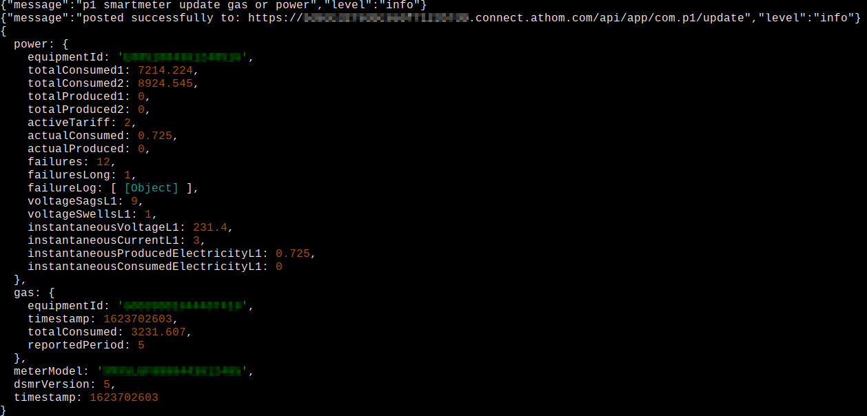 {“message”:{“meterType”:“ISk5\2MT382-1003”,“electricity”:{“received”:{“tariff1”:{“reading”:11223.242,“unit”:“kWh”},“tariff2”:{“reading”:11337.393,“unit”:“kWh”},“actual”:{“reading”:0.35,“unit”:“kW”}},“delivered”:{“tariff1”:{“reading”:998.707,“unit”:“kWh”},“tariff2”:{“reading”:2222.431,“unit”:“kWh”},“actual”:{“reading”:0,“unit”:“kW”}},“tariffIndicator”:1,“switchPosition”:1,“voltageSags”:{},“voltageSwell”:{},“instantaneous”:{“current”:{“L1”:{“unit”:“A”},“L2”:{“unit”:“A”},“L3”:{“unit”:“A”}},“power”:{“positive”:{“L1”:{“unit”:“kW”},“L2”:{“unit”:“kW”},“L3”:{“unit”:“kW”}},“negative”:{“L1”:{“unit”:“kW”},“L2”:{“unit”:“kW”},“L3”:{“unit”:“kW”}}}}},“gas”:{“deviceType”:“003”,“unit”:“m3”}},“level”:“debug”}