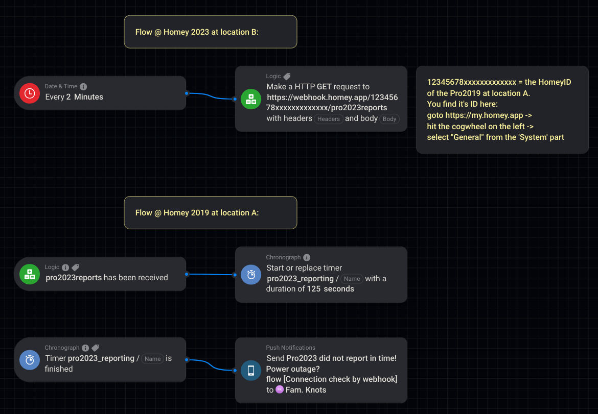 I have a slightly different setup: I have two buildings, building A and B. These are in different locations and A has a Homey Pro 2019 and a Synology NAS. B is in an area with frequent outages and has a Homey Pro 2023.